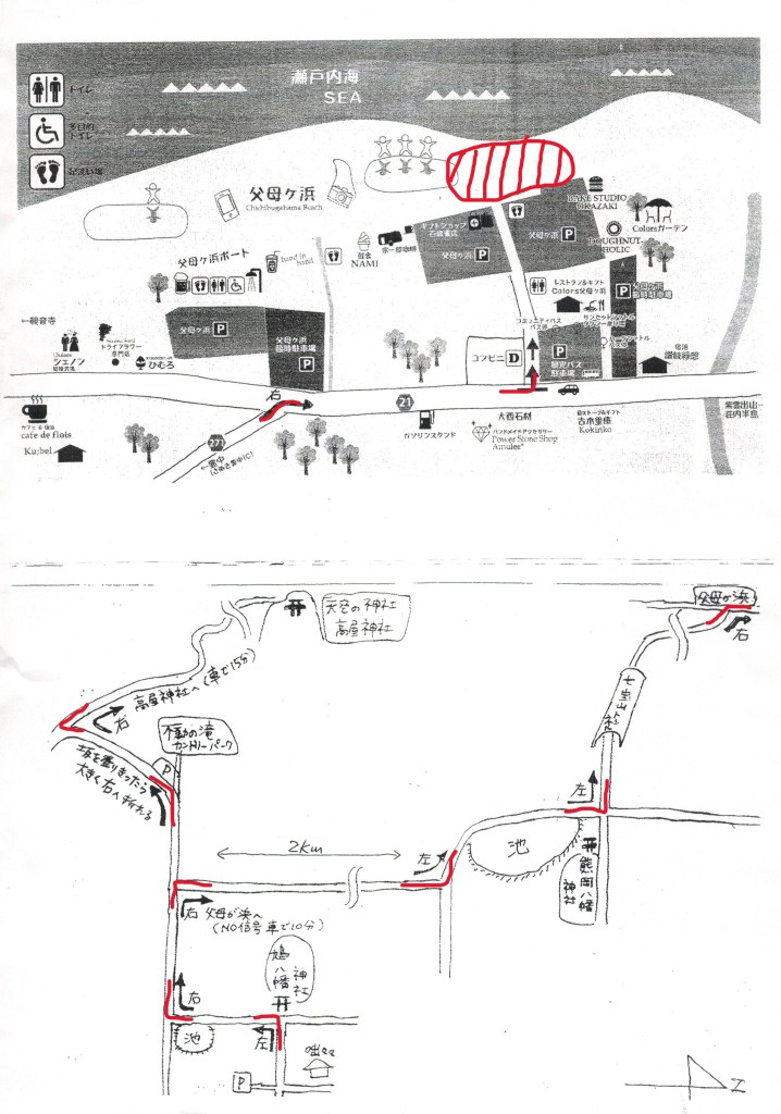 父母ヶ浜への最短経路です。赤丸斜線の箇所が撮影スポットで、夕方になるとボランティアの方が来て写真を無料で撮ってくれます。