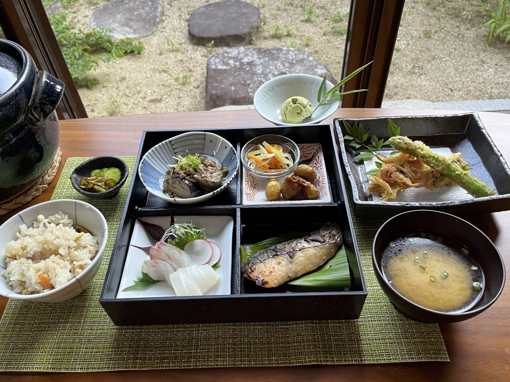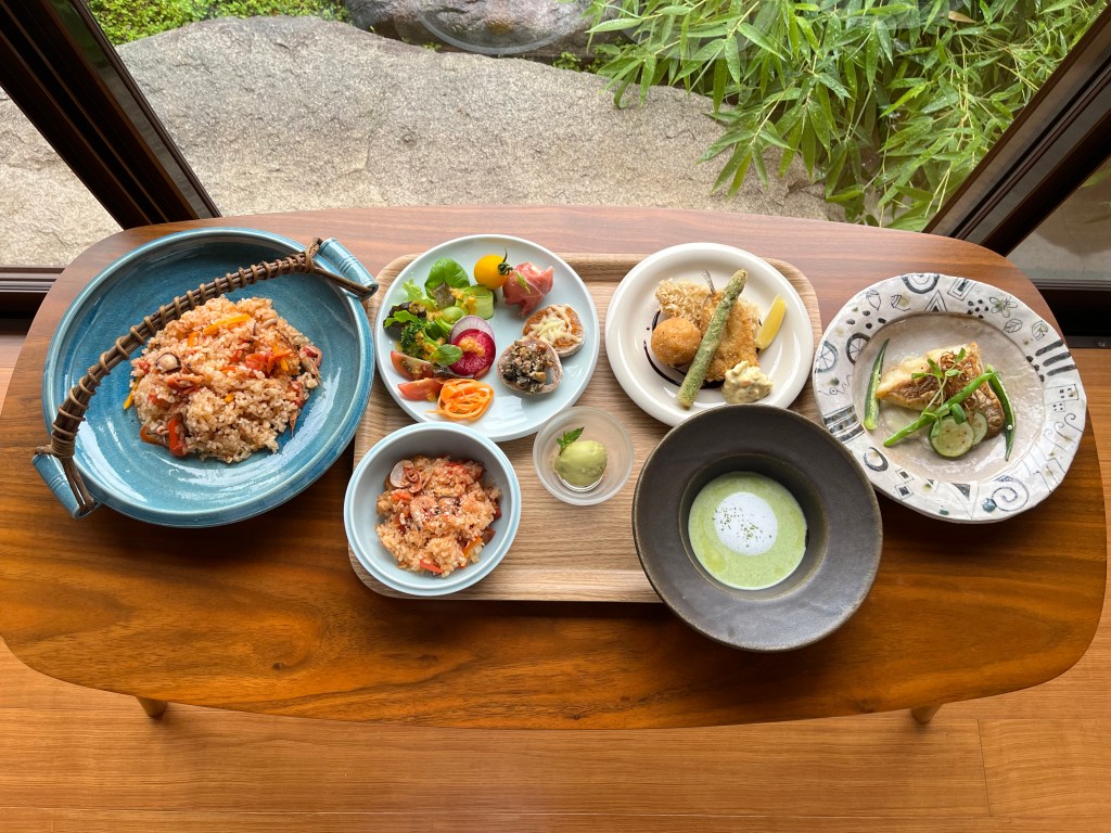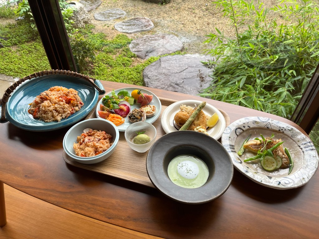 お客様をお迎えする日の朝は、自家農園で野菜を収穫し、出汁を取る所から始まります。味噌、ドレッシング、マスタード、コンフィチュールなど、出来るだけ自家製の物を使い調理します。朝食には、地元農家や自家農園で採れた有機野菜のサラダ、使わなかった葉や芯、皮の部分を煮出したベジタブルブロスがベースの旬の野菜がたくさん入った土地のめぐみのスープ、低温長時間熟成で発酵させたくるみバケットやひまわりカンパーニュなどのハード系の自家製パン、20年以上製造販売を続ける自家焙煎の珈琲、派手さはないけれど体に優しい料理を提供します。